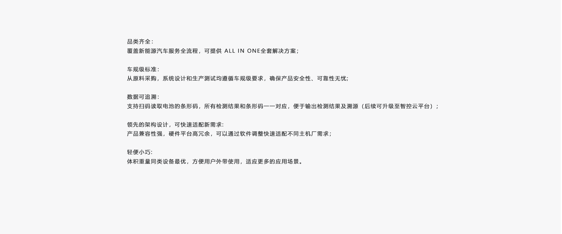 隨著鋰電池在電動汽車、儲能、電動兩輪車等各種場合應用越來越廣泛,為了保障安全、壽命及性能,鋰電池的售后維保也變得越來越重要和通用化。我司提供鋰電池維保整套解決方案,可以對電池模組進行充放電檢測、電池包的氣密性檢測以及對不均衡的電芯進行均衡操作,所有的設備都具有便攜性,適合在場外進行操作。檢測數據可以無紙化記錄,并且可以上傳至用戶數據庫,保證所有的售后操作具備可溯源性。